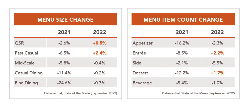 Average menu size declined during COVID and has remained smaller in 2022 in response to ongoing supply chain issues. However, segments like QSR and Fast Casual have benefited from streamlined operations and are expanding their menus, primarily around core menu items like entrées.5
